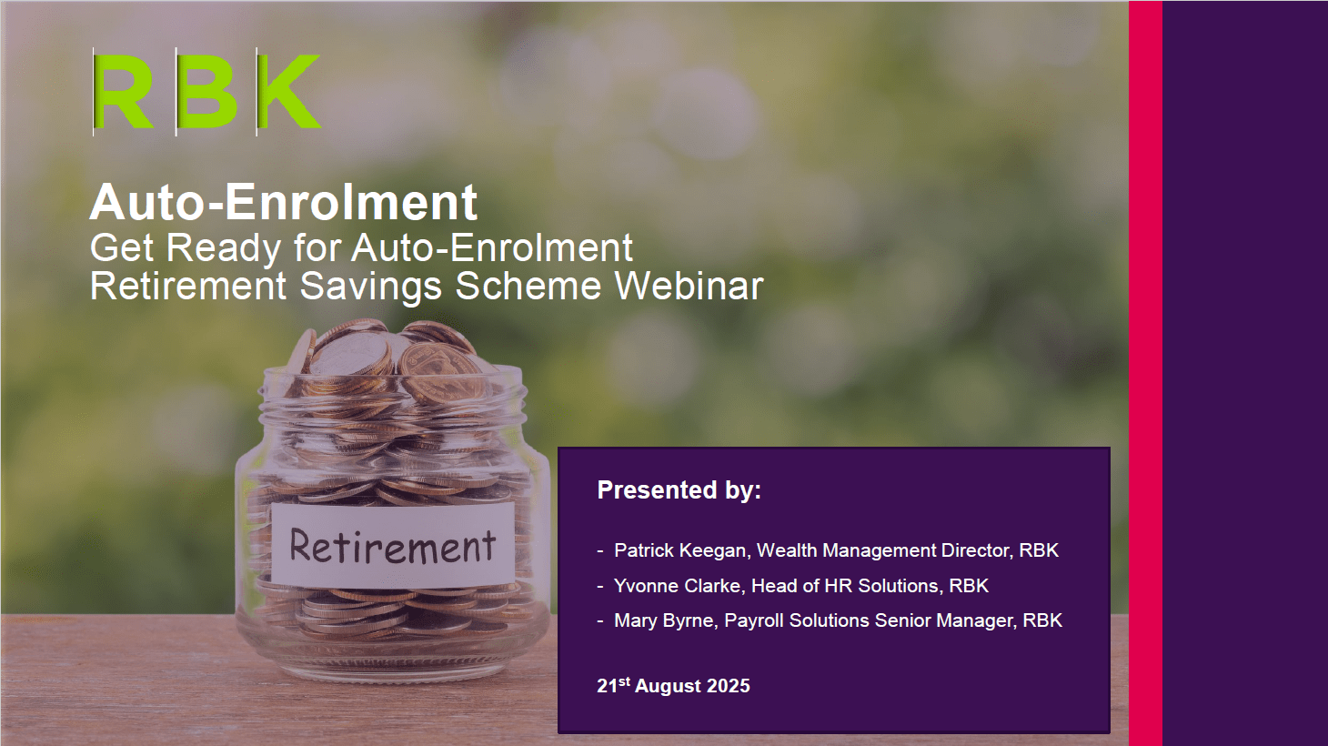 RBK held a webinar on 21st August 2025 on the upcoming Pension Auto-Enrolment changes, hosted by our expert speakers - Patrick Keegan (Wealth Management Director), Yvonne Clarke (Head of HR Solutions), and Mary Byrne (Senior Payroll Manager), who shared key insights for employers, outlined the business impacts, and discussed steps employers can take to prepare for its impact their business.